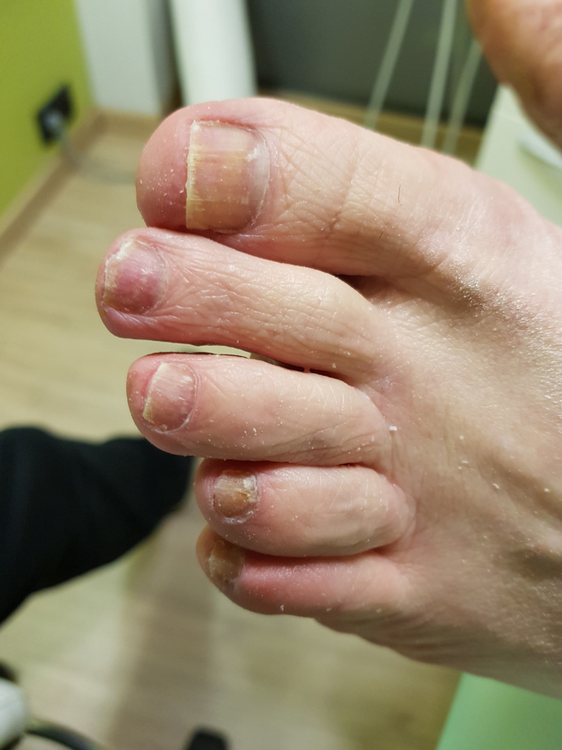 - Een afwijkende vorm van de nagel (bijvoorbeeld een bolle nagel)